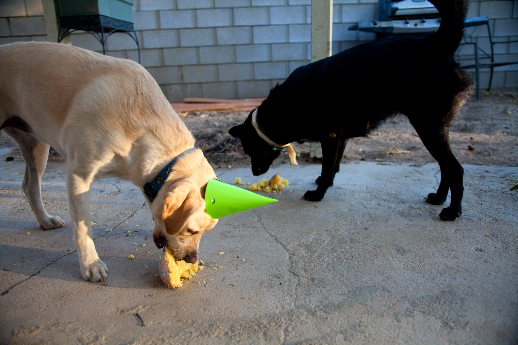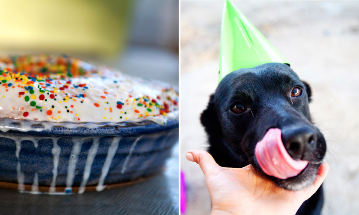 The past few months have been so crazy-busy that I forgot to celebrate a couple important puppy milestones: Zoe’s 6 month adoption birthday & Bella turning 2! On Friday, I decided it was past time for a puppy party! So I went out and bought some colorful party hats, slid a doggy cake (with sprinkles!) into the oven and made a makeshift pool out of a storage box for the water-loving Zoe. The excitement was palpable. The party started off with a mad run around the yard, a couple splashes in the makeshift pool and then out came the hats. Oh My. Bella was having none of it, she immediately pawed it off and looked at me with her brown, reproachful eyes. Zoe was a little easier to distract, but soon she started asking “what is this on my head?!” then the meltdown ensued: